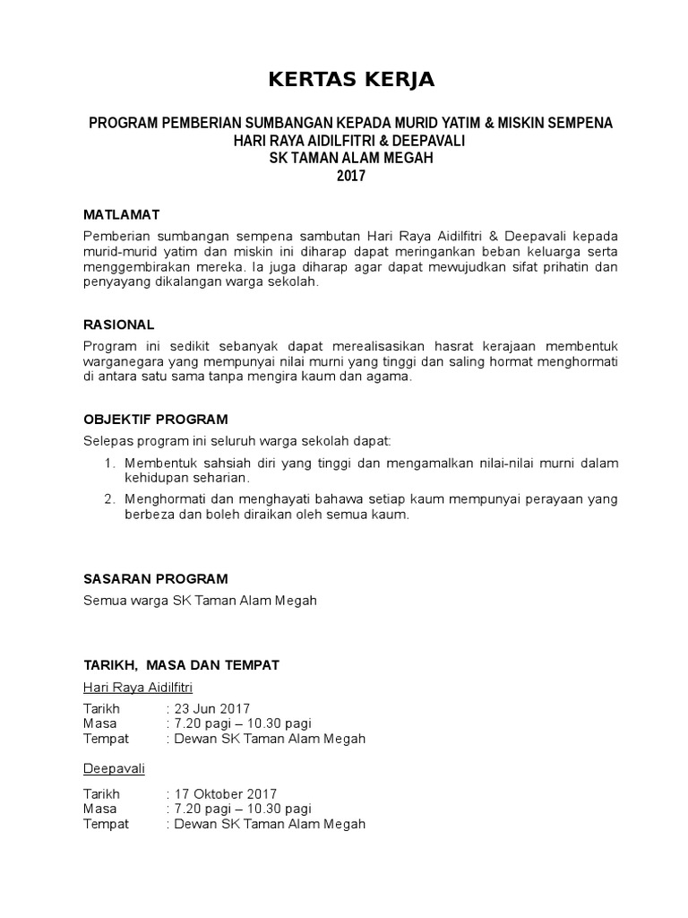 Tujuan setiap kertas kerja adalah berbeza walau bagaimana pun jabatan hendaklah menekankan kepada matlamat justifikasi output outcome dan kesan. KERTAS KERJA MAJLIS INFAK RAMADHAN 2017 SMK BUKIT KUCHING TENGAH PENDAHULUAN Majlis Infak Ramadhan ini merupakan program yang dirancang oleh Musolla Ar Raudhah dengan kerjasama Panitia Pendidikan Islam SMK Bukit Kuching Tengah. Program Sumbangan Hari Raya Aidilfitri 2021 tajaan Malik Streams Corporation anjuran Pertubuhan Pembangunan dan Kebajikan Masyarakat Batu Kuala Lumpur di Dewan Dato Alex Lee Jalan Ipoh Kuala Lumpur.